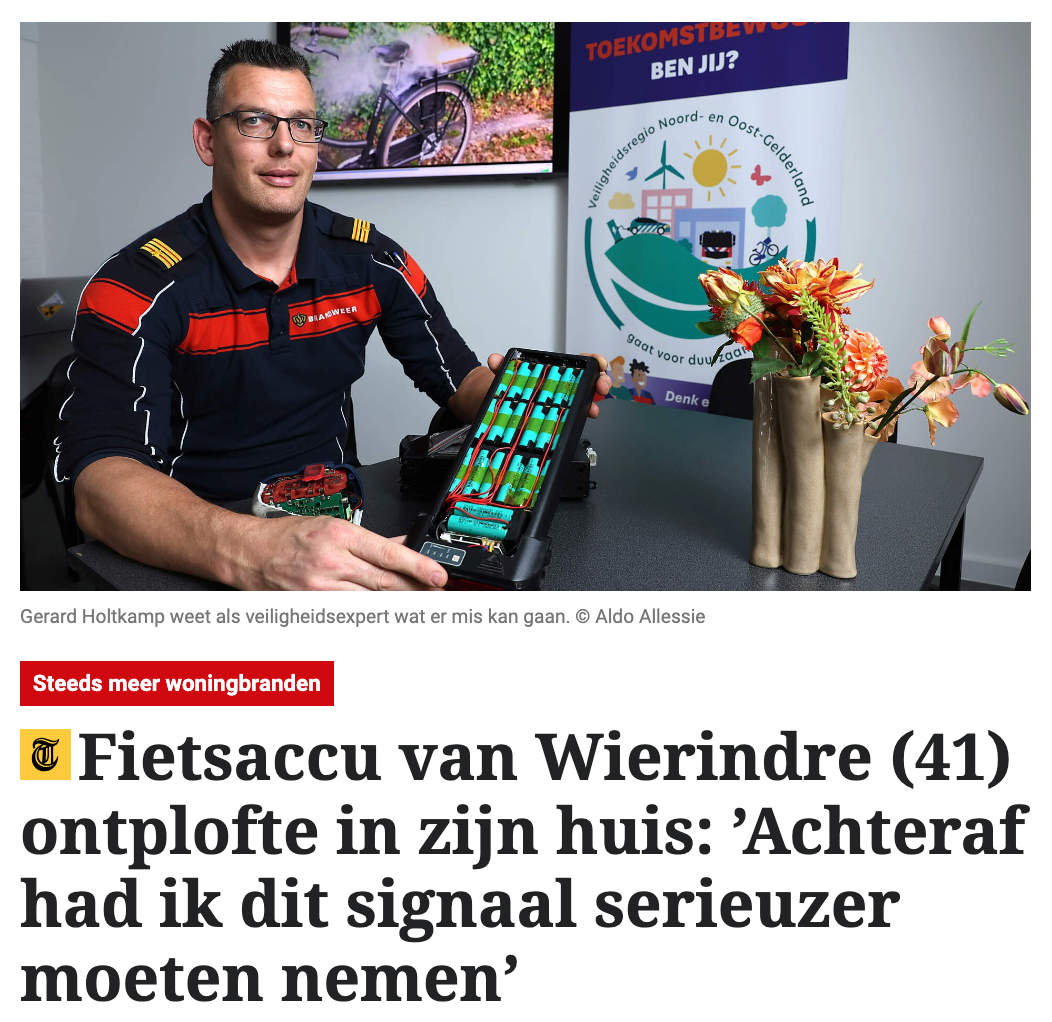 东北海尔德兰安全区的安全专家Gerard Holtkamp表示,住宅电池火灾在荷兰快速增加