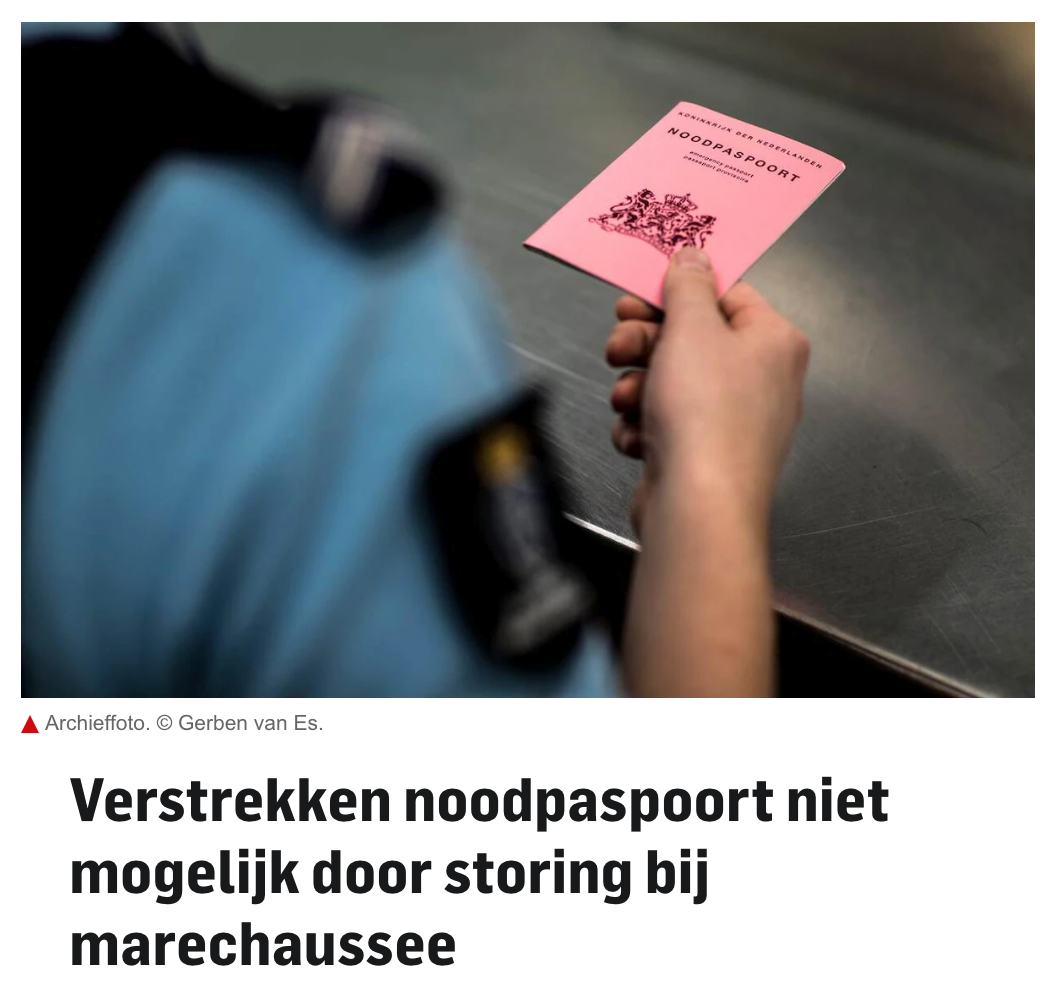 不仅是NS系统“罢工”,连Koninklijke Marechaussee(皇家宪兵队)也在周一早上中招——其负责的紧急护照(noodpaspoort)系统同样陷入技术故障,导致无法签发任何临时旅行证件。