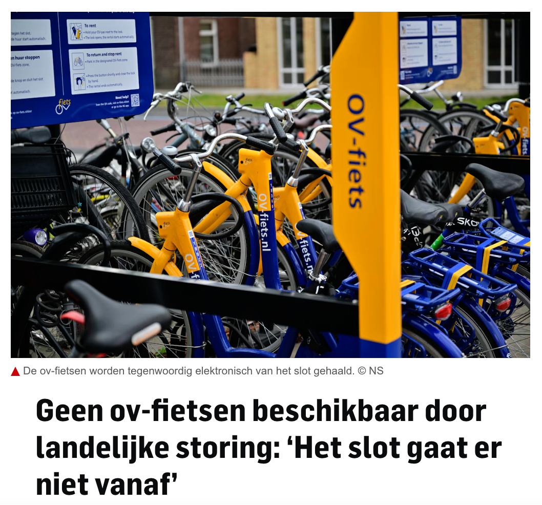 据ad.nl报道,荷兰铁路公司(NS)周一早上突发全国性技术故障,导致全荷兰的OV-fiets(共享租车)系统全面瘫痪。
